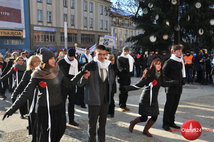 Happening zorganizowany przez uczniów i grono pedagogiczne Zespołu Szkół Elektronicznych i Telekomunikacyjnych w Olsztynie. Uczniowie zatańczyli poloneza przed olsztyńskim ratuszem, następnie ruszyli na starówkę w kolorowym korowodzie | Centrum Olsztyna | 24.01.2014 r.