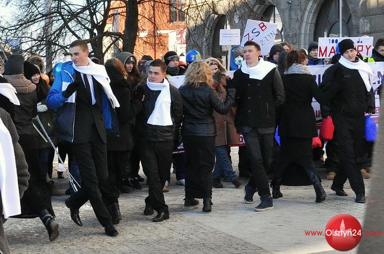 Happening zorganizowany przez uczniów i grono pedagogiczne Zespołu Szkół Elektronicznych i Telekomunikacyjnych w Olsztynie. Uczniowie zatańczyli poloneza przed olsztyńskim ratuszem, następnie ruszyli na starówkę w kolorowym korowodzie | Centrum Olsztyna | 24.01.2014 r.