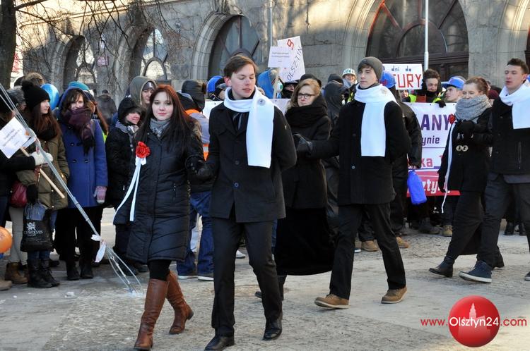 Happening zorganizowany przez uczniów i grono pedagogiczne Zespołu Szkół Elektronicznych i Telekomunikacyjnych w Olsztynie. Uczniowie zatańczyli poloneza przed olsztyńskim ratuszem, następnie ruszyli na starówkę w kolorowym korowodzie | Centrum Olsztyna | 24.01.2014 r.