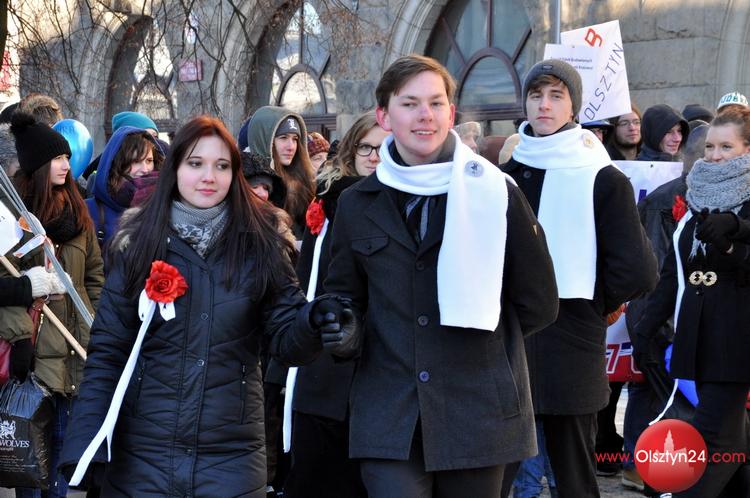 Happening zorganizowany przez uczniów i grono pedagogiczne Zespołu Szkół Elektronicznych i Telekomunikacyjnych w Olsztynie. Uczniowie zatańczyli poloneza przed olsztyńskim ratuszem, następnie ruszyli na starówkę w kolorowym korowodzie | Centrum Olsztyna | 24.01.2014 r.